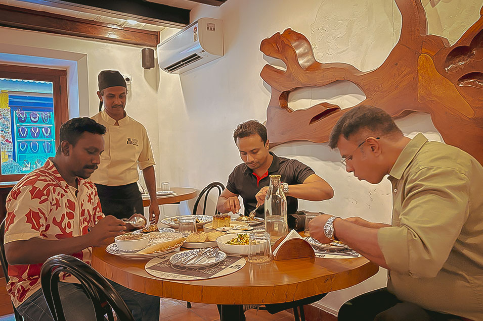 The food here is simple, hearty, and made from scratch. We serve a mix of Middle Eastern plates, traditional Jewish recipes, and local Kerala dishes. It’s the kind of place where you can sit down for a heavy lunch or just order a few plates to share over a long conversation.